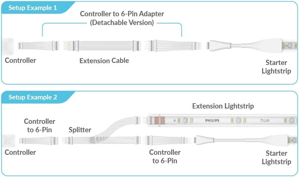 This Controller to 6-Pin Adapter, specifically designed for the Philips Hue Lightstrip system, allows for any Litcessory product or a Philips Lightstrip Plus Extension to be connected directly to a Philips Hue Lightstrip Plus controller. These adapters solve the issue created by the starter lightstrip either being directly attached to the controller (the Hardwired Version) or the issue created by the controller’s connector size being smaller than any Litcessory product or a Philips Hue Lightstrip Plus Extension (the Detachable Version). One adapter connects to the controller and the other attaches to the starter lightstrip. Once both adapters are attached, it will provide a 6-pin connection between the controller and the starter lightstrip that can be used to attach any Litcessory product or a Philips Hue Lightstrip Plus Extension.