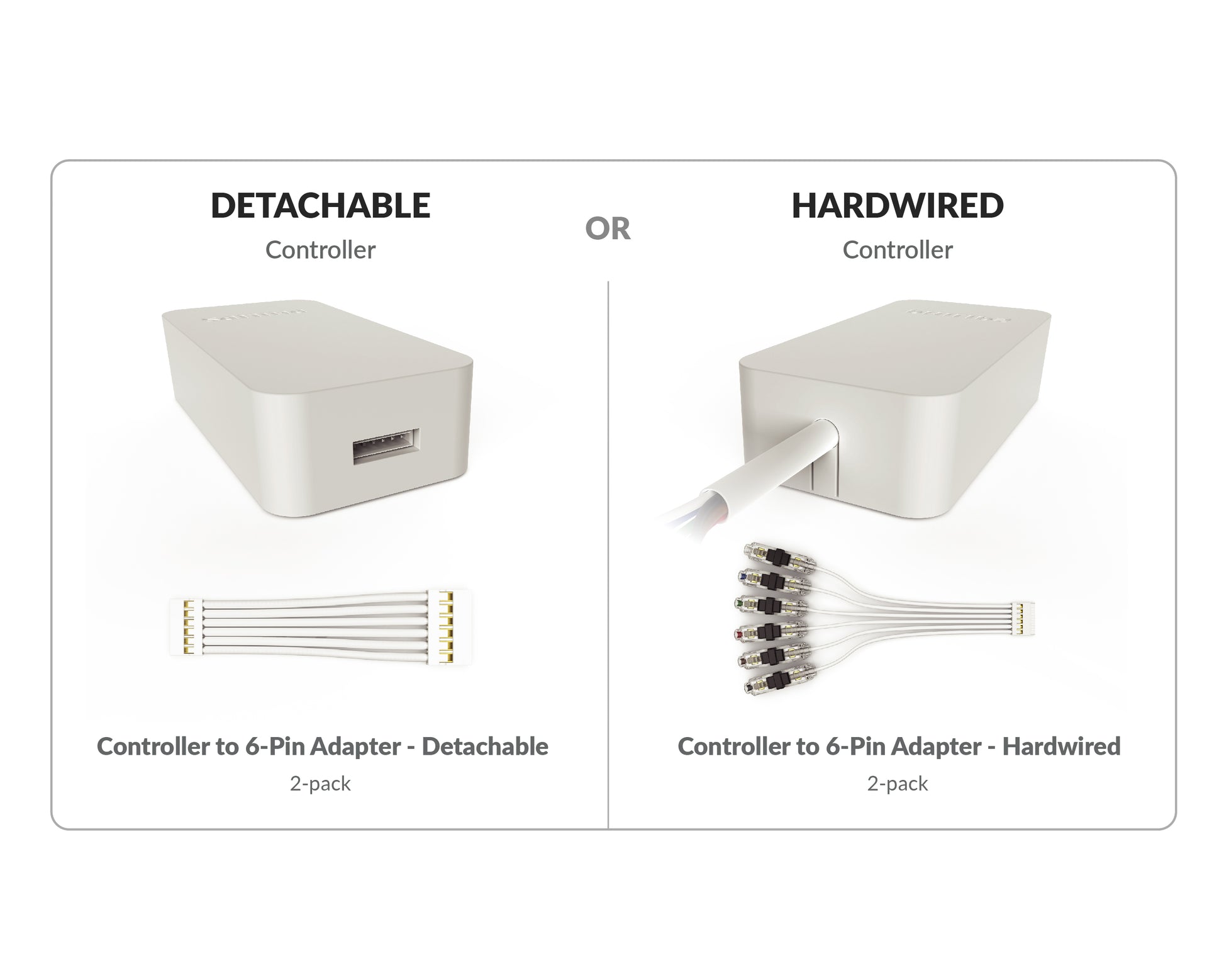 Philips Hue only allows for a single continuous lightstrip run. Litcessory products allow for several! This Controller to 6-Pin Adapter, specifically designed for the Philips Hue Lightstrip system, allows for any Litcessory product or a Philips Lightstrip Plus Extension to be connected directly to a Philips Hue Lightstrip Plus controller. There are two version of this adapter, a hardwired version and a detachable version. You will need to identify which version you need by looking at your Philips Hue Lightstrip Plus controller. These adapters solve the issue created by the starter lightstrip either being directly attached to the controller (the Hardwired Version) or the issue created by the controller’s connector size being smaller than any Litcessory product or a Philips Hue Lightstrip Plus Extension (the Detachable Version). One adapter connects to the controller and the other attaches to the starter lightstrip. Once both adapters are attached, it will provide a 6-pin connection between the controller and the starter lightstrip that can be used to attach any Litcessory product or a Philips Hue Lightstrip Plus Extension.