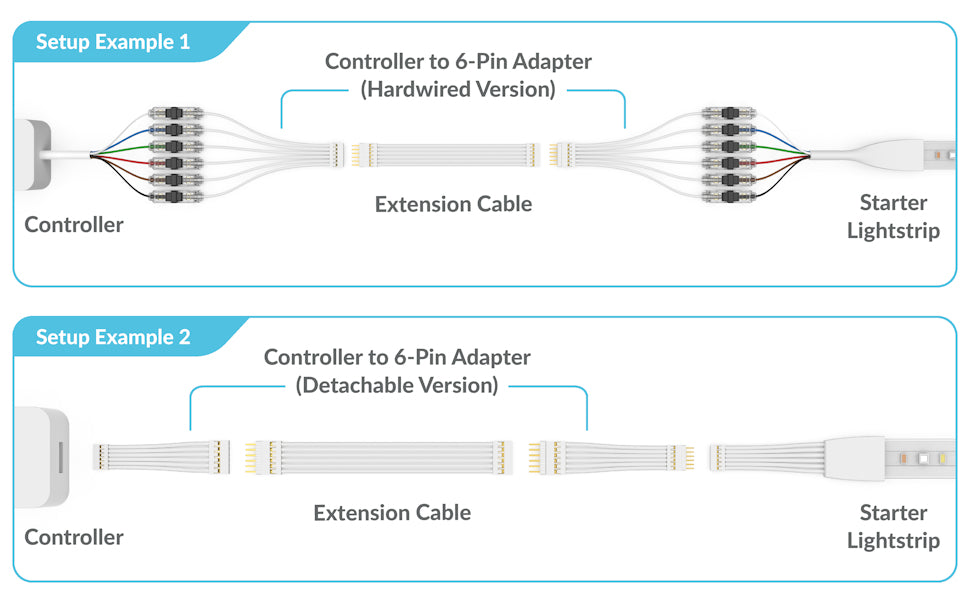 To extend the distance between the controller and the lightstrip, you will first need to connect one of our Controller to 6-Pin Adapters . Then you can plug in an extension cable.