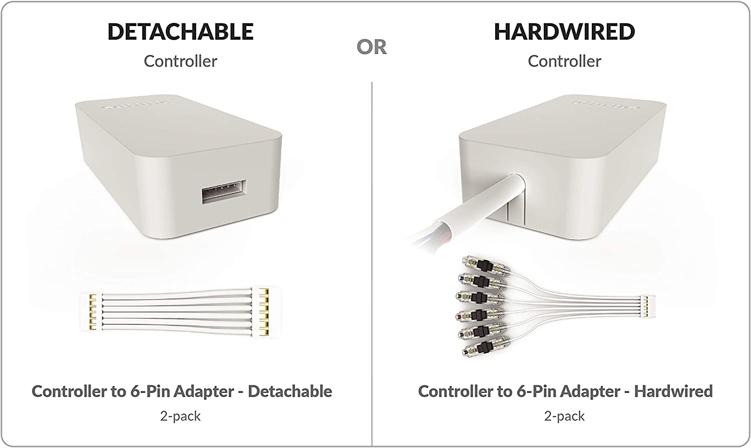 This Controller to 6-Pin Adapter, specifically designed for the Philips Hue Lightstrip system, allows for any Litcessory product or a Philips Lightstrip Plus Extension to be connected directly to a Philips Hue Lightstrip Plus controller. These adapters solve the issue created by the starter lightstrip either being directly attached to the controller (the Hardwired Version) or the issue created by the controller’s connector size being smaller than any Litcessory product or a Philips Hue Lightstrip Plus Extension (the Detachable Version). One adapter connects to the controller and the other attaches to the starter lightstrip. Once both adapters are attached, it will provide a 6-pin connection between the controller and the starter lightstrip that can be used to attach any Litcessory product or a Philips Hue Lightstrip Plus Extension.