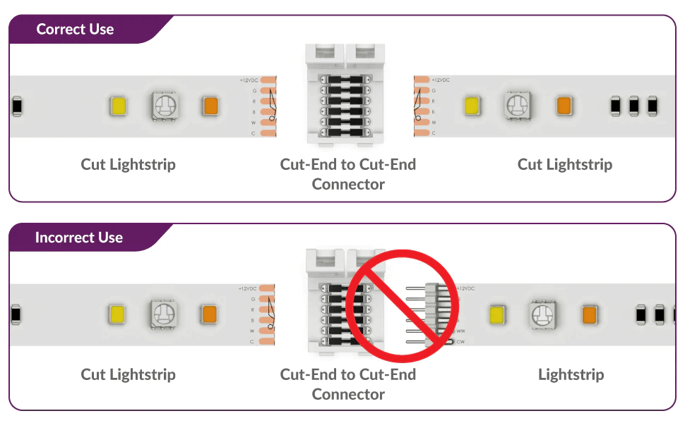 Remember: Cut lightstrips connect to only cut-end connectors and 6-pin ends can only connect to 6-pin connectors. Cut lightstrips cannot connect to a 6-pin connector.