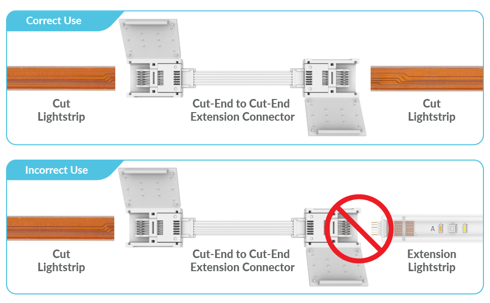 Remember: Cut lightstrips connect to only cut-end connectors and 6-pin ends can only connect to 6-pin connectors. Cut lightstrips cannot connect to a 6-pin connector.