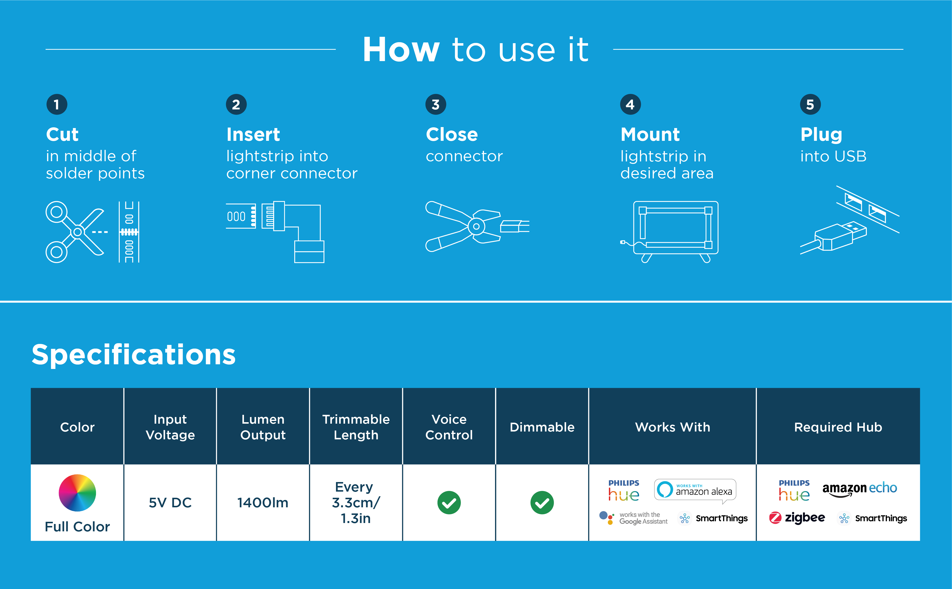 - 1. Connect to cut-end connector side of the cable to the cut Philips Hue lightstrip.