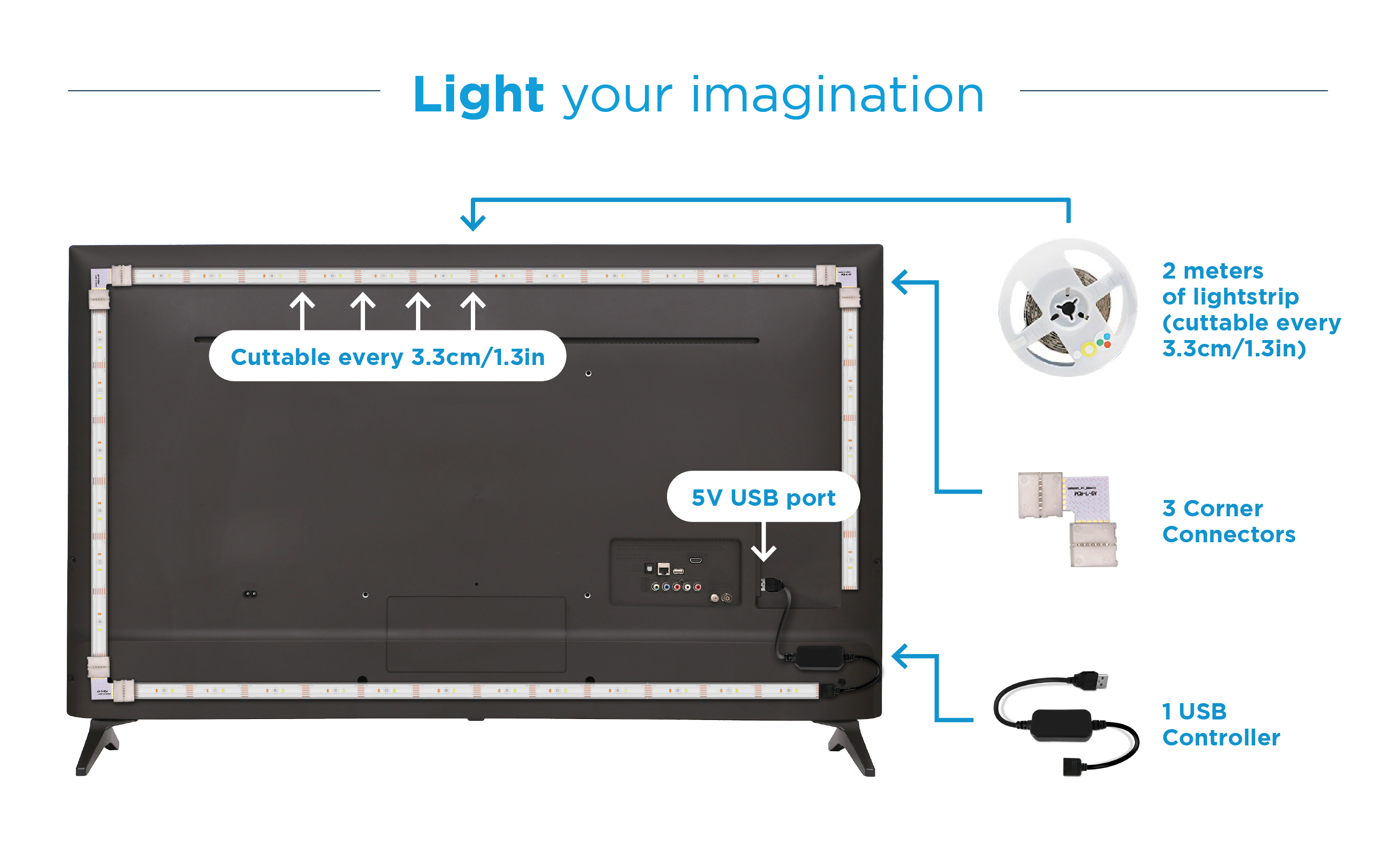 Includes 6.6 feet of the lights strip - 3 corner connectors and a USB controller