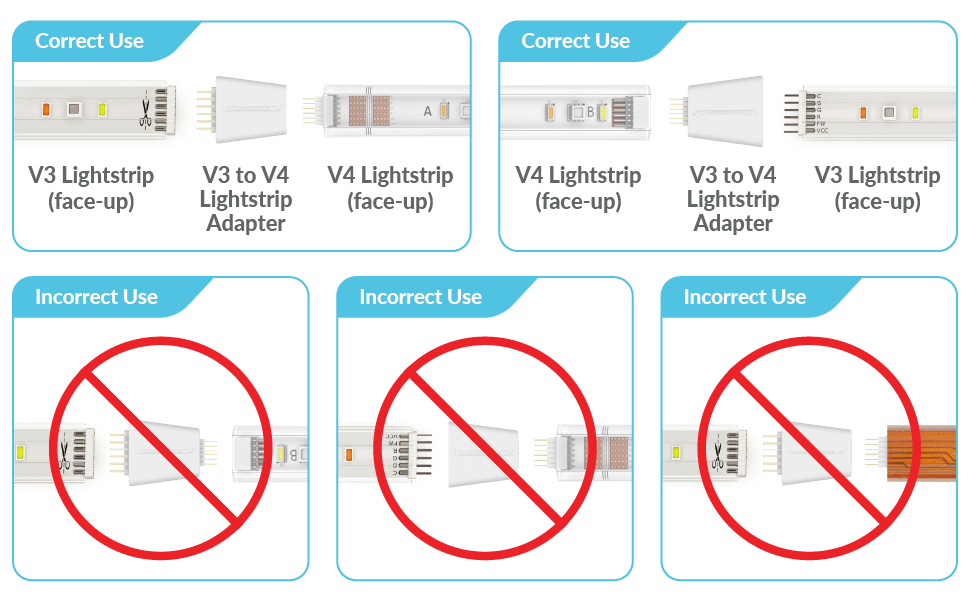 Philips Hue only allows for a single continuous lightstrip run. Litcessory products allow for several! This V3 to V4 Adapter, specifically designed for the Philips Hue Lightstrip system, enables you to connect a V3 lightstrip to a V4 lightstrip and visa versa. This allows you to interchange lightstrip versions without issue.